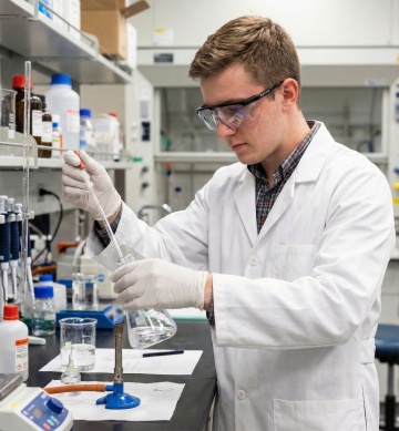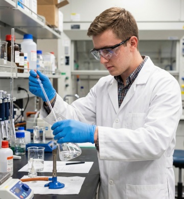 超写实风格的现代实验室场景,以蓝色和白色为主色调,光线明亮柔和,采用高清晰度的摄影质感,画面干净规整,适合做背景。实验室内部有身着白色防护服的研究人员正在操作先进的精密仪器,仪器外观呈白色和蓝色,带有显示屏和控制面板。背景是由白色方块和灰色方块组成的墙面,地面为浅色,整体环境整洁有序,设备排列整齐,空间感开阔,营造出专业、严谨、科技感十足的氛围,无任何文字、LOGO、二维码及冗余信息,视觉焦点清晰,细节丰富,适合作为科技、医疗、研究相关的背景使用。