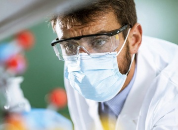 现代化高科技实验室场景,画面干净规整,适合作为背景。明亮的白色与蓝色调为主,洁净的白色墙面镶嵌着深蓝色方块瓷砖,地面为光滑的浅灰色。前景有两位身着全套白色防护服、佩戴护目镜和口罩的科研人员,一位正坐在操作台边专注查看电脑屏幕,另一位站立于大型精密仪器前操作控制面板。实验室中央和后方分布着多台先进的白色与银色相间的分析仪器、设备,带有蓝色显示屏和控制面板,仪器间有金属管道和电缆有序连接。右侧有机械臂装置,左侧前景有透明玻璃容器和绿色植物点缀。整体光线均匀柔和,以冷色调为主,营造出专业、严谨、先进且一尘不染的科研氛围,构图平衡,空间感强,视觉层次分明,信息传达清晰,符合高科技科研环境的审美与功能需求。