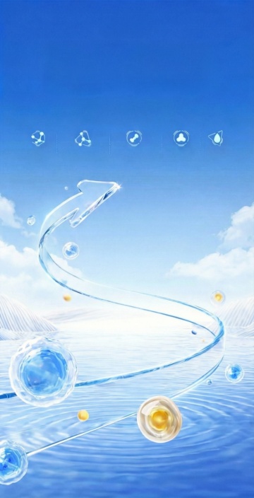 一张以透明水泡和蓝色水流为主体的3D渲染背景图,画面中充满了大小不一、晶莹剔透的水泡,其中最大的水泡内包含一个由多个小分子结构组成的透明球体,水泡表面有细腻的高光和反光效果,背景是渐变的浅蓝色调,光线柔和明亮,营造出纯净、清新、科技感十足的氛围,整体构图采用了梦幻般的悬浮效果,水滴和水泡的形态自然流畅,具有高度的透明质感和立体感,适合作为纯净科技或护肤品相关的背景使用。