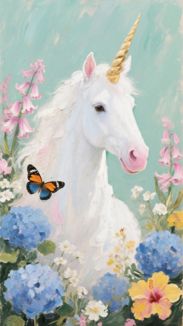 梦幻唯美的油画风独角兽,金色螺旋角点缀花丛,蝴蝶翩跹,厚涂笔触营造清新柔和的超现实意境。