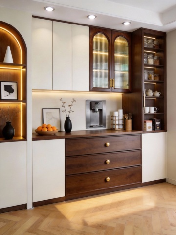 极简主义风格的现代厨房,整体采用米白色哑光橱柜与浅灰色大理石台面,搭配原木色开放搁板,嵌入式黑色抽油烟机与银色微波炉位于灶台上方,台面摆放黑色锅具、两个橙色水果、透明玻璃罐和陶瓷碗,白色竖纹瓷砖墙面,自然光透过窗户形成柔和的光影效果洒在地面,整体氛围简洁明亮、干净整洁,具有高级的空间层次感和现代家居美学。