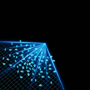 白色背景上,由蓝色半透明渐变线条构成的抽象科技感图案,线条呈现出波浪状的流动形态,点缀着发光的蓝色光点,整体画面简洁、现代,具有未来感和科技感,线条和光点的排列形成了富有节奏感的视觉效果。