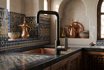 超写实3D渲染的现代厨房水龙头特写,极简主义设计风格,银色金属质感水龙头搭配可旋转出水口,安装在白色光滑人造石台面上,嵌入式不锈钢水槽带有圆形排水口,下方为深灰色哑光橱柜配银色长条形拉手,背景是浅色木质地板,柔和自然光从上方照射形成细腻高光与阴影,整体呈现干净、高级、宁静的氛围,注重材质纹理细节与空间层次感,不同角度展示水龙头在现代厨房环境中的多种布局搭配。