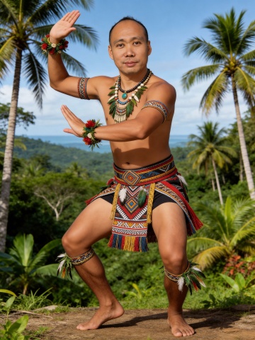 热带风情中,男子身着刺绣风民族服饰,手工编织细节与自然光影交织,展现质朴与清新之美。
