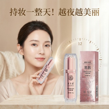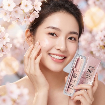 一张年轻女性手持护肤品、渐变紫色背景的美妆广告风格图片