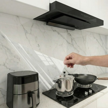 极简主义风格厨房室内设计,整体采用现代简约美学,以黑白灰为主色调,搭配深灰色大理石纹理台面和黑色大理石纹背景墙,上部为浅灰色哑光橱柜,下部为白色哑光柜门,台面中央嵌入式黑色电磁炉,台面上左侧放置一个黑色圆形果盘,内有红黄相间的苹果和梨,背景墙下方台面上从左至右依次摆放着不锈钢水槽、黑色花盆中的绿色植物、红色小番茄、不锈钢保温杯、木质砧板和白色陶瓷花瓶,顶部橱柜下方有长条状暖黄色LED灯带提供柔和照明,光线在大理石表面形成细腻的光影反射,营造出干净、整洁、高级的空间氛围,无任何文字、LOGO及二维码元素。