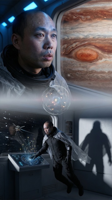 未来感科技舱内,双重曝光展现宇航员与虚拟星图互动,3D光影交织,粒子流动,金属质感与神秘宇宙共融,呈现虚拟现实中的星际探索。