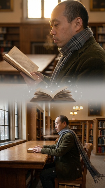 双重曝光风融合胶片质感,书页幻化为漂浮的星光与雪花,营造梦幻而静谧的冬日阅读场景,超现实主义手法展现文艺感与光影交织的诗意。