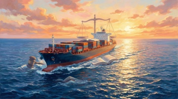 正面视角的大型货轮航行在蔚蓝海面上,船头撞开白色浪花,船身装载着红、黄、蓝、绿彩色集装箱,天空中飘着蓬松白云和飞翔的海鸥,采用扁平化插画风格,色彩明快饱和,线条简洁流畅,海浪呈现规律的波纹纹理,整体画面充满航海的活力与自由氛围。