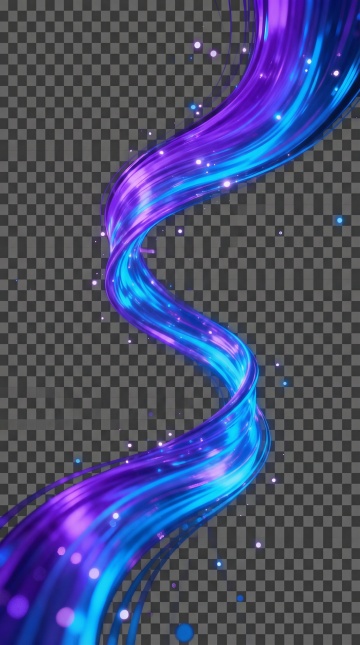 抽象艺术风格,画面以深邃的暗紫色为背景,中央是一条蜿蜒流动的半透明丝绸,丝绸呈现出渐变的宝石蓝与玫瑰金交织的色彩,表面带有细腻的珠光纹理,轻盈飘逸的形态如同被微风拂动,周围环绕着柔和弥散的浅紫色烟雾,烟雾边缘朦胧虚化,整体光影柔和,高光处有细微的光斑闪烁,营造出神秘而优雅的氛围,构图采用竖版S形曲线布局,视觉引导线流畅自然,背景与主体色彩形成冷暖对比,增强画面层次感。
