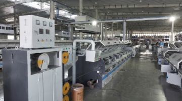 现代化工业场景,蓝色为主色调,清新明亮的光线,干净整洁的生产线,透明玻璃幕墙外是蓝天白云,绿色植物点缀在车间角落,机械臂精准运作,地面反光如镜,整体氛围充满科技感与希望