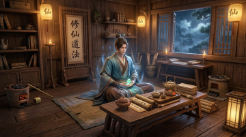 古典中式风格,3D重拟物设计,融合水墨意境与木雕质感,营造静谧神秘的修仙氛围,虚拟现实中的东方禅意空间。