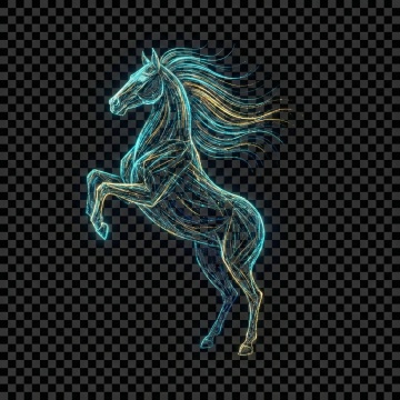 霓虹灯风描边马,蓝金双色交织,光影流动,粒子点缀,未来感与科技感交融,虚拟自然中的梦幻酷炫造型。