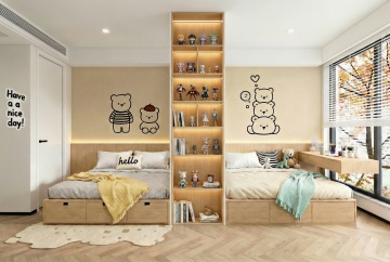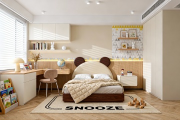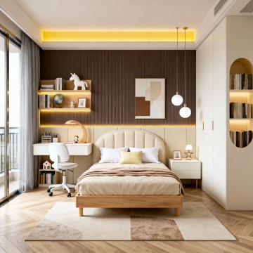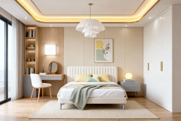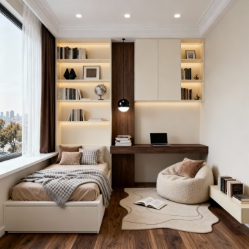 现代简约风格卧室,以米白色和浅木色为主色调,柔和的暖黄色间接光源(天花板灯带、床头壁灯)营造温馨宁静氛围。中央是一张铺着米白色床单和浅棕色针织毯的双人床,床头有两个白色靠枕和一个带褶皱装饰的抱枕。床的右侧是浅木色床头柜,上面放着一盏白色台灯和一本翻开的书。床尾铺着浅灰色地毯。左侧靠墙有一个浅木色开放式书架,摆放着绿植、装饰品和书籍,书架旁有一把浅色扶手椅和小圆几。背景墙挂着一幅花卉装饰画和两朵立体花瓣装饰。落地窗挂着米白色半透明窗帘,透进柔和自然光,整体空间明亮通透,布局对称平衡,材质上融合了布艺的柔软与木质的温润,细节精致,线条简洁流畅。