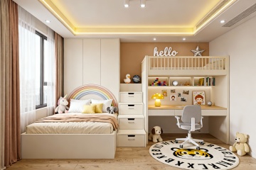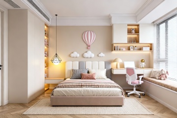 现代简约风格卧室,以白色为主色调,搭配浅棕色与原木色,整体氛围明亮温馨。中央是一张白色软包靠背大床,铺着白色床单和橙白条纹的被子,床尾搭着一条浅棕色毯子,床头摆放着两个黄色毛绒玩具。床的两侧各有一个白色床头柜,左侧床头柜上放着一个插有白色和淡黄色花朵的透明花瓶。房间左侧是一扇大窗户,挂着白色纱帘和浅棕色厚窗帘,阳光透过窗户洒入,在地板和浅色编织地毯上形成柔和的光影。天花板上悬挂着一盏白色花瓣造型的吊灯,墙壁上挂着两幅现代抽象装饰画,画面以粉色、橙色和绿色为主。房间采用木地板,整体构图呈现出舒适、整洁、温馨的居家氛围,光线充足,光影自然,细节质感细腻。