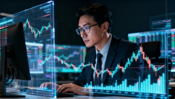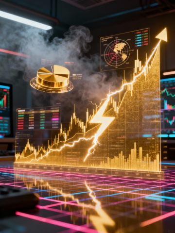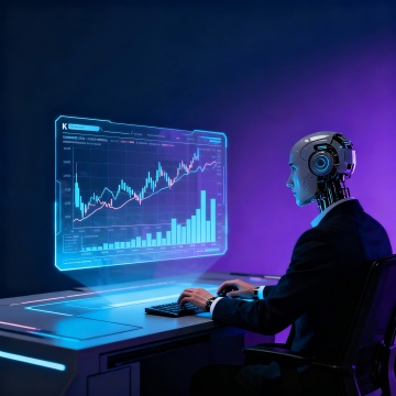 未来科技感的数字金融交易大厅场景,蓝色和紫色为主色调的霓虹灯光效果,前景是全息投影的动态股票走势图,红色和蓝色的K线在透明网格上实时波动,背景是布满数据代码流的巨大弧形LED屏幕墙,地面反射着灯光形成波光粼粼的效果,空气中漂浮着全息数据点和金融符号,远处有穿着科技感制服的交易员在半透明操作台进行虚拟交易,整体画面充满科技感和金融数据的流动感,光影层次丰富,前景清晰的走势图与背景模糊的交易大厅形成虚实结合的景深效果,营造出高端、前沿的金融科技氛围。