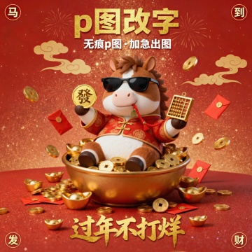 本形象以“Q版招财马”为核心,突破传统严肃的生肖表达,融入现代卡通美学与吉祥文化符号。小马表情亲和,形态圆润,结合“金币、红包、福字、橘子、舞狮”等新春元素,突出“招财进宝、福气满满”的轻松主题。视觉上采用3D柔和渲染与温暖色调,兼具文化感与商业亲和力
