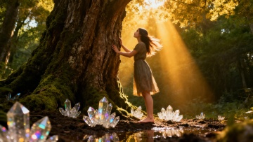 梦幻插画风,超现实主义虚拟自然,水彩质感,少女与森林精灵共舞,光影交织。