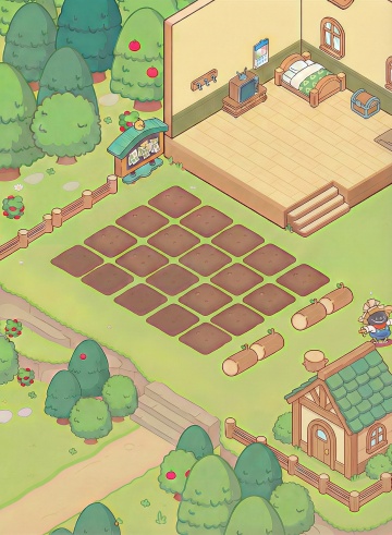 插画风的虚拟自然景观,清新舒适,小屋与绿树相映,营造出宁静的田园氛围。