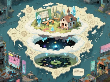 清新插画风,虚拟自然景观,舒适小屋点缀,营造宁静夏日氛围。
