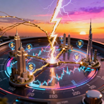 赛博朋克风格的金融数据可视化背景,深蓝色与霓虹粉为主色调,光影呈现科技感十足的网格光线与动态数据流,前景是发光的红色上升曲线图与蓝色网格线交织,背景为模糊的未来城市夜景,整体画面具有强烈的景深效果和玻璃质感,数据线条流畅且充满科技动态感,营造出高端、专业的金融科技氛围。