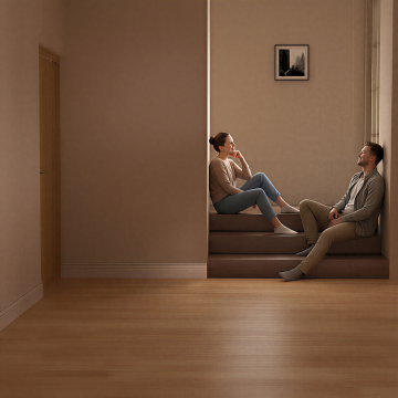 极简主义室内场景,大面积浅色木纹地板占据画面主体,地板呈现自然流畅的直纹与山纹交错纹理,木色从浅米白到淡暖黄渐变,木板拼接处有细微自然的缝隙与色差变化。左上角斜射进入柔和的自然光,在地板上形成清晰的长条形光影区域,光影过渡自然柔和,带有轻微的高光反光。背景是一面纯净的浅米色墙壁,墙底有白色踢脚线,整体色调统一和谐,营造出明亮、通透、宁静的氛围。地板材质展现出细腻的木质肌理和真实的3D质感,画面构图采用低角度透视,增强空间纵深感,光线层次丰富,阴影细节柔和。