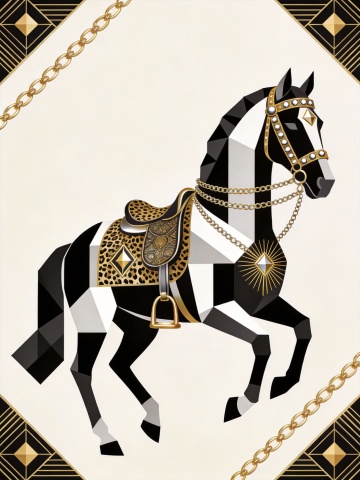 古典感与国潮风交融,黑骏马身披鎏金刺绣鞍鞯,几何线条勾勒优雅轮廓,扁平插画风格尽显中式奢华气韵。