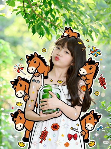 卡通马头与春节元素拼贴,插画风emoji点缀,营造可爱喜庆氛围,街头感与节日气息交融。