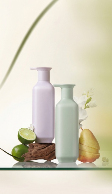 高质感3D渲染的日化包装设计图,四个不同样式的液体瓶身(包含原白色按压泵瓶在内,另三个分别为不同轮廓线条设计,如圆柱形、方形切角、扁圆弧形),每个瓶身采用纯色但互不相同的配色(如浅蓝、淡粉、薄荷绿、米白),均为光滑塑料材质,带有细腻高光与柔和阴影,统一以正面视角排列成整齐的横向队列,背景为纯白色,整体画面干净简洁,突出产品形态与色彩对比,具有清晰的产品展示感和现代简约设计风格。