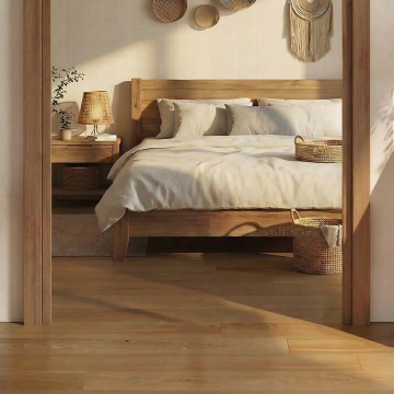 极简主义室内场景,大面积浅色木纹地板占据画面主体,地板呈现自然流畅的直纹与山纹交错纹理,木色从浅米白到淡暖黄渐变,木板拼接处有细微自然的缝隙与色差变化。左上角斜射进入柔和的自然光,在地板上形成清晰的长条形光影区域,光影过渡自然柔和,带有轻微的高光反光。背景是一面纯净的浅米色墙壁,墙底有白色踢脚线,整体色调统一和谐,营造出明亮、通透、宁静的氛围。地板材质展现出细腻的木质肌理和真实的3D质感,画面构图采用低角度透视,增强空间纵深感,光线层次丰富,阴影细节柔和。