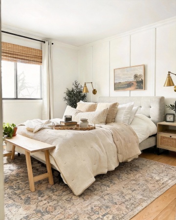 现代简约风格卧室,以浅米色和原木色为主色调,整体明亮温馨。中央摆放一张米色布艺软包床头的双人床,床上铺着米白色床单和浅色针织毯,搭配多个同色系枕头。床的右侧是一个原木色床头柜,上面放着一盏白色台灯和一个白色杯子。床的左侧靠墙处有一个原木色多层搁板架,摆放着绿植、装饰品和书籍。房间左侧有一扇大窗户,挂着浅米色落地窗帘,窗边放着一把浅色单人椅和一个小圆木桌。墙上挂着一幅花卉装饰画和三个立体花朵装饰。天花板有嵌入式灯带,营造出柔和的间接照明效果,地面铺着浅灰色地毯,整体空间干净整洁,光线充足,充满舒适宁静的居家氛围。