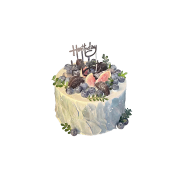 一个精致的圆形蛋糕,白色背景,蛋糕主体为淡紫色渐变奶油质地,表面覆盖着均匀的深紫色糖霜淋面,自然垂坠形成流畅的条纹,顶部边缘装饰着一圈螺旋状的白色奶油花,中央整齐摆放着7颗新鲜的蓝莓,蓝莓表面带有自然光泽和细小果蒂,蛋糕底部边缘有一圈精致的白色蕾丝状奶油花边,整体呈现出清新甜美的烘焙甜点风格,光影柔和,高光细腻,色彩过渡自然,具有高度写实的食物摄影质感。