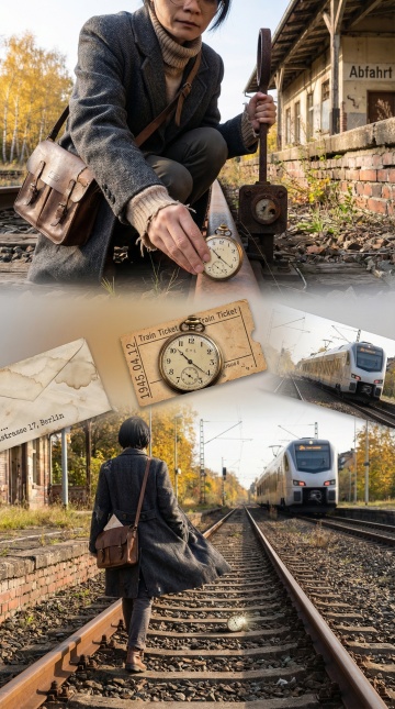 复古胶片风拼贴,双重曝光融合旧站台与现代列车,怀表与车票诉说时光故事,文艺超现实感交织时空旅人。