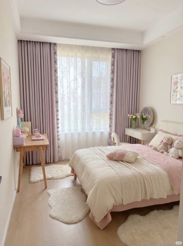现代简约风格卧室,以白色为主色调,搭配浅棕色与原木色,整体氛围明亮温馨。中央是一张白色软包靠背大床,铺着白色床单和橙白条纹的被子,床尾搭着一条浅棕色毯子,床头摆放着两个黄色毛绒玩具。床的两侧各有一个白色床头柜,左侧床头柜上放着一个插有白色和淡黄色花朵的透明花瓶。房间左侧是一扇大窗户,挂着白色纱帘和浅棕色厚窗帘,阳光透过窗户洒入,在地板和浅色编织地毯上形成柔和的光影。天花板上悬挂着一盏白色花瓣造型的吊灯,墙壁上挂着两幅现代抽象装饰画,画面以粉色、橙色和绿色为主。房间采用木地板,整体构图呈现出舒适、整洁、温馨的居家氛围,光线充足,光影自然,细节质感细腻。