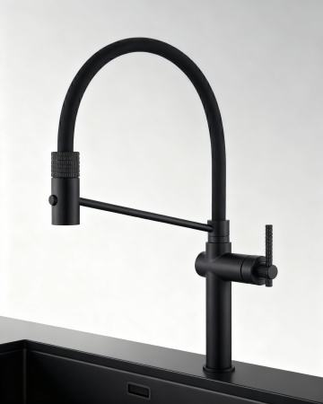超写实3D渲染的现代厨房水龙头特写,极简主义设计风格,银色金属质感水龙头搭配可旋转出水口,安装在白色光滑人造石台面上,嵌入式不锈钢水槽带有圆形排水口,下方为深灰色哑光橱柜配银色长条形拉手,背景是浅色木质地板,柔和自然光从上方照射形成细腻高光与阴影,整体呈现干净、高级、宁静的氛围,注重材质纹理细节与空间层次感,不同角度展示水龙头在现代厨房环境中的多种布局搭配。