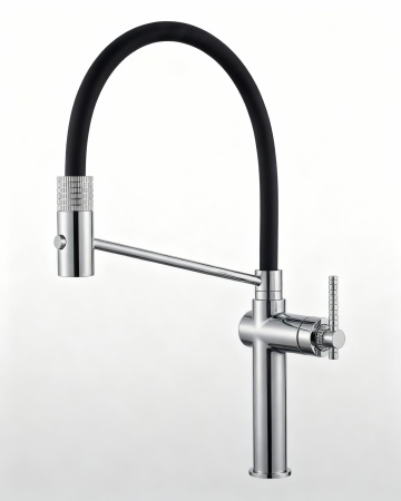 现代简约风格厨房场景,不锈钢材质的银色水龙头安装在白色石英石台面上的嵌入式水槽边缘,水龙头线条流畅、设计简洁,带有弯曲的出水嘴和旋钮式开关,表面光滑且有金属反光质感。台面干净整洁,左侧窗台上摆放着一盆盛开的白色百合花,右侧窗台上放置着几个新鲜的青柠和柠檬,窗外透进明亮的自然光,光线柔和地洒在台面和水龙头上,形成淡淡的阴影和高光,整体氛围清新、明亮、整洁、温馨,具有现代家居的舒适感和简约美学。
