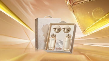 水彩风背景晕染喜庆红,鎏金灯笼点缀中式感,3D重拟物精华瓶透出清透奢华,新年焕肤主题尽显节日氛围。