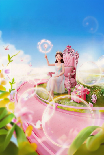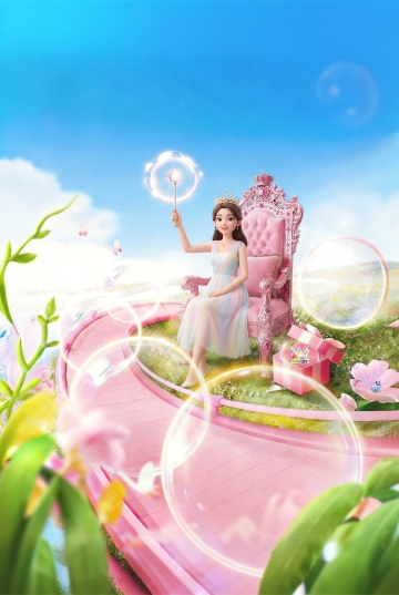 清新软3D风,卡通女孩手捧鲜花,置身金黄麦田与风车旁,营造童话般温馨场景。