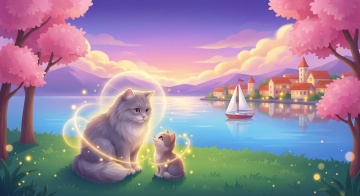 一张花园场景的插画,画面中央是一个白色尖桩栅栏门,门上有一个由茂密绿叶和大量盛开的粉色玫瑰花组成的花拱,栅栏门敞开着,露出里面修剪整齐的绿色草坪和一座带有圆形窗户和尖顶的白色小屋,小屋周围环绕着各种绿色灌木和花卉,天空湛蓝,飘着几朵白色的云朵,阳光明媚,光线充足,整个画面充满了宁静、温馨、浪漫的氛围,色彩鲜艳,细节丰富,具有写实的质感和梦幻的田园风格。