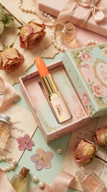 以暖黄为主色调,搭配口红的粉调、瓶身的金棕与花枝的浅黄,营造出温暖、优雅且精致的氛围,尽显美妆品的魅力。