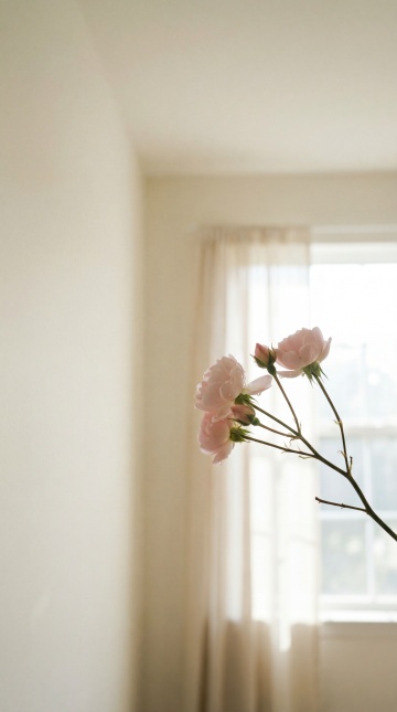 粉紫色渐变背景,柔和的粉色花朵与绿色叶子的自然元素,采用磨砂玻璃质感纹理,整体画面呈现出朦胧、梦幻、柔和的氛围,色彩过渡自然,光影柔和,植物元素分布在画面一侧,具有淡雅的装饰性。