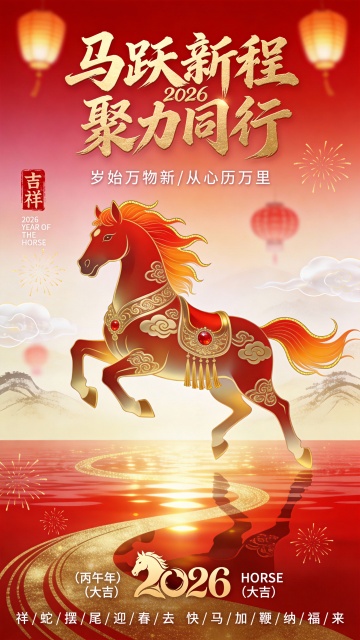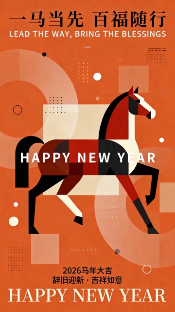 扁平几何风格融合国潮元素,鎏金文字点缀喜庆红马,象征2026马年福运迎新。