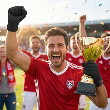 一张展现足球运动员动态瞬间的高质量摄影风格海报,画面中央是身着红色运动服的足球运动员正全力踢向足球的特写镜头,运动员姿态舒展充满力量感,足球上的黑白纹路清晰可见,绿色的足球场上草叶细节丰富。背景是夕阳西下时分的天空,橙黄色的阳光洒在整个场景上,形成温暖而富有戏剧性的光影效果,远处有模糊的其他球员和看台轮廓,天空中点缀着少量白色云朵。整体画面采用三分法构图,主体突出,色彩以红、绿、橙黄为主色调,光影对比强烈,高光和阴影细节丰富,营造出充满活力、激情四射的运动氛围,具有极强的视觉冲击力和信息传达效率,符合体育赛事宣传海报的设计感和目标受众审美。