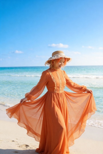 清新唯美的海边写真,橙色长裙随风飘扬,蕾丝点缀尽显优雅文艺,实景自然光打造浪漫时尚感,面料轻盈如诗。