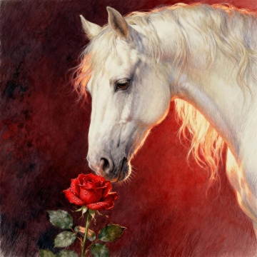 梦幻光影交织的白骏马,油画厚涂质感,粒子流动如星尘,红金漩涡背景营造神圣氛围,插画风呈现虚拟自然之美。