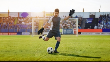 写实摄影风格,阳光明媚的足球场上,一名身着红色球衣的足球运动员正全力踢向足球的动感瞬间,运动员姿态舒展,腿部肌肉线条紧绷,足球表面纹理清晰,绿色草坪在夕阳暖金色光线照射下显得生机勃勃,背景有模糊的其他球员和观众席轮廓,天空中飘着少量白云,整体画面光影对比强烈,高光处有自然的光晕效果,氛围充满活力与运动激情,动态感十足,细节丰富,色彩真实和谐,具有电影般的画面质感和身临其境的临场感。