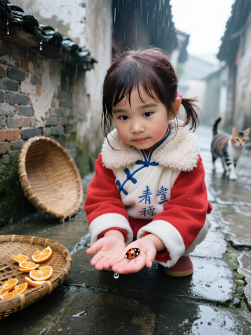 水墨风与胶片感交织,古巷雨中童趣盎然,国潮风服饰点缀质朴场景,实景感十足的温馨画面,传递出浓郁的故事感与中式复古情怀。