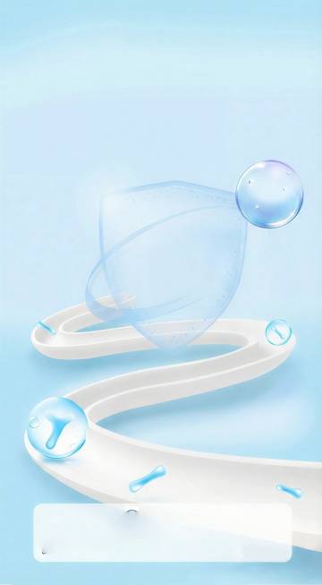 3D渲染风格的护肤品精华液广告海报,画面整体变换为以清新的蓝色调为主,搭配透明的水感白色,营造纯净科技的氛围。中央是一个透明的球形精华液胶囊,内部可见清晰的分子结构和悬浮的小气泡,周围环绕着流畅规整的液体波浪线条,波浪呈对称的弧形排布,大小不一的透明气泡均匀分布在画面中,整体构图平衡有序,光影柔和,高光表现细腻,液体质感通透富有光泽,视觉层级清晰,突出产品的科技感与纯净特质,信息传达高效,符合高端护肤品的目标受众审美。