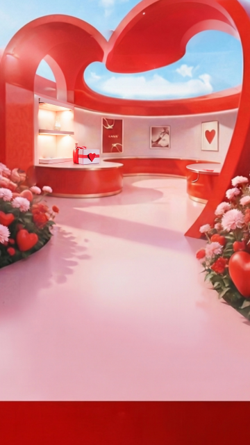 梦幻软3D风,霓虹灯心形拱门,甜美浪漫,点缀气球与玫瑰,情人节主题设计。