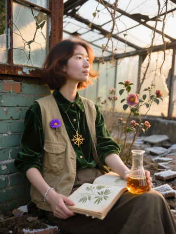 复古感与文艺感交织,静谧光影中,女子于破败温室阅读植物图鉴,油画风质感浮雕般呈现,实景氛围浓厚。